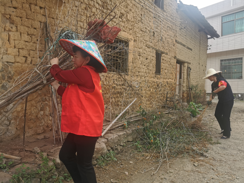“来,阿姨,我们一起帮忙把这堆柴火杂物整理一下,把楼前的垃圾打扫干净。”4月18日,在抚市镇抚溪村“东升楼”里,抚溪村党支部党员志愿者和楼内的群众一起开展土楼环境卫生整治。