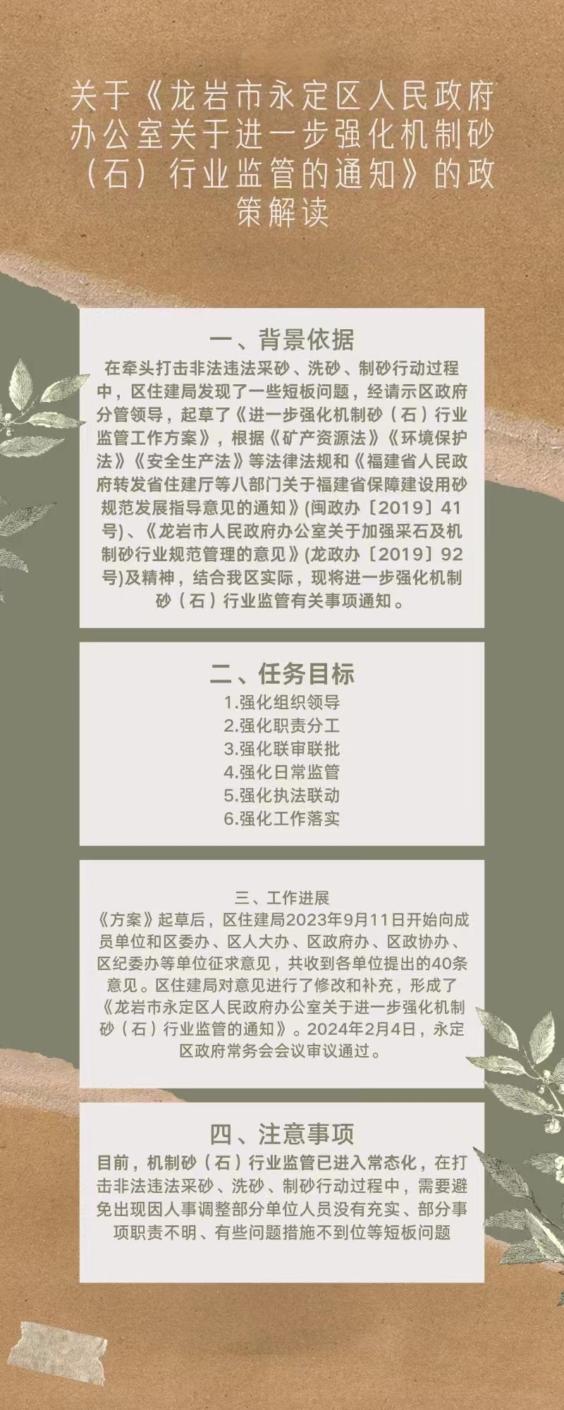 - 专家解读:龙岩市永定区人民政府办公室关于进一步强化机制砂(石)行业监管的通知 [2024-02-28]