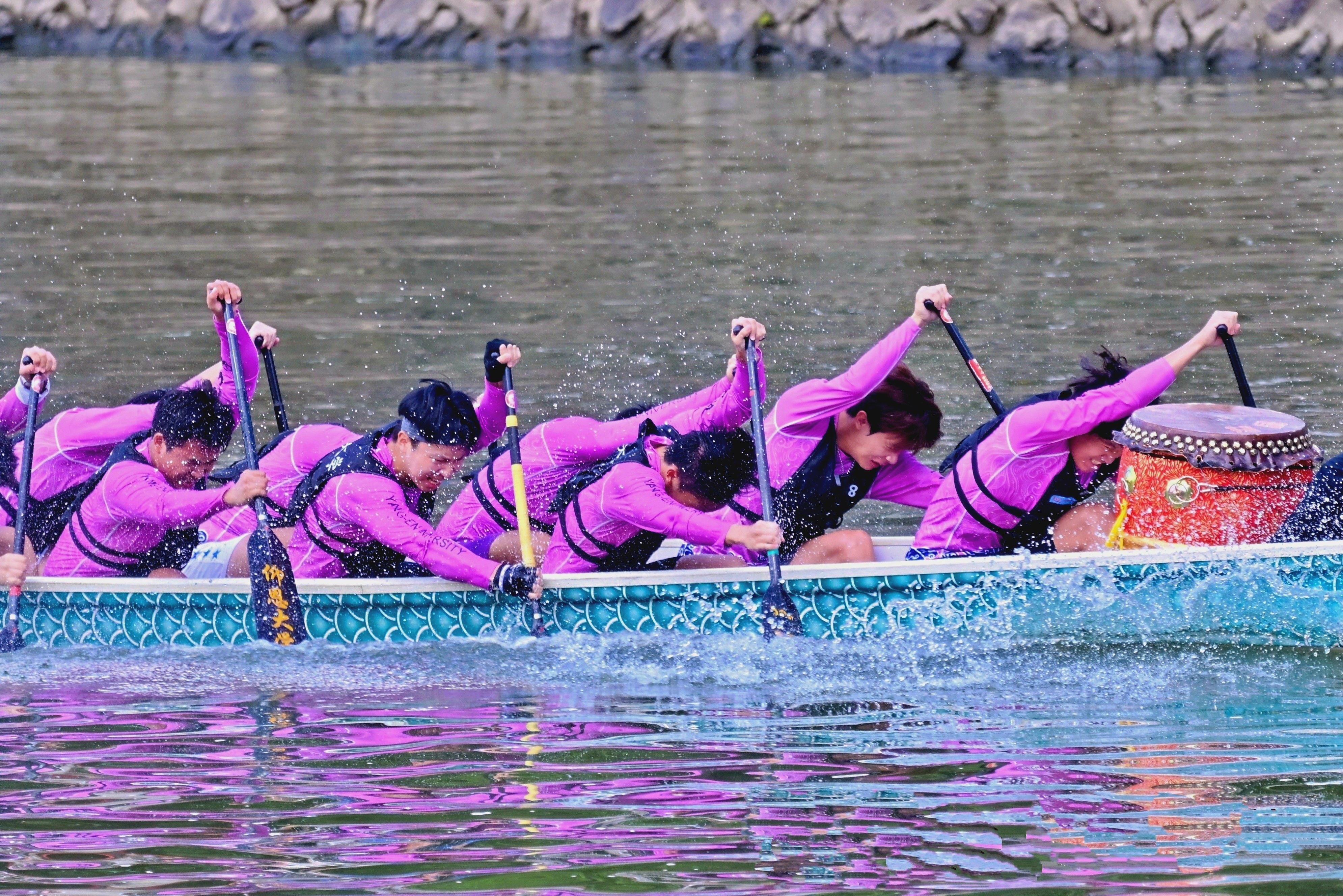 比赛现场,随着发令枪响,多艘龙舟如离弦之箭劈波斩浪。队员们身着统一队服,动作整齐划一,鼓手击出铿锵有力的鼓点,划手们桨叶入水声与岸边观众呐喊助威声交织成曲,浪花飞溅间将现场气氛推向高潮。本次赛事设置男/女子100米、200米、500米直道竞速三大项目,采用预赛、复赛、决赛三轮晋级制,全面考验各队伍的速度、协作与战术水平。